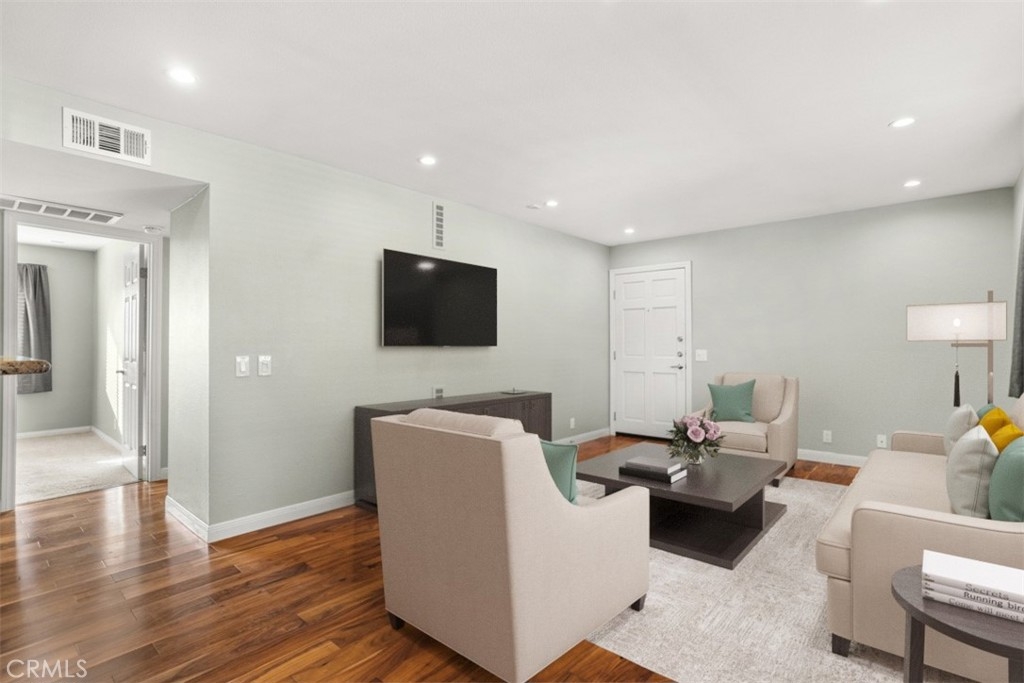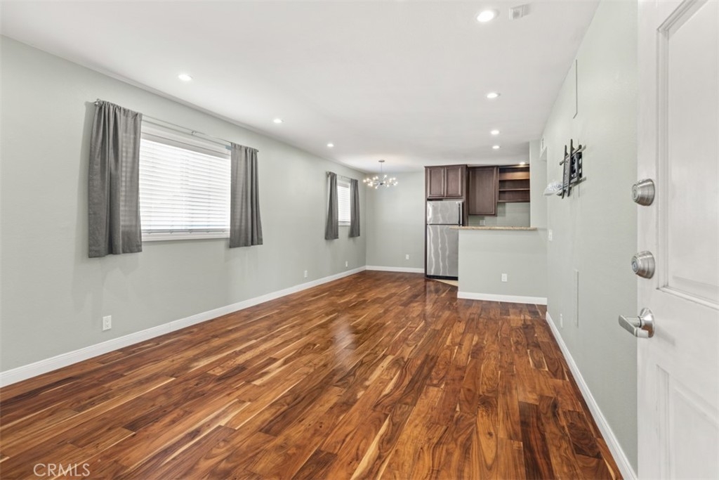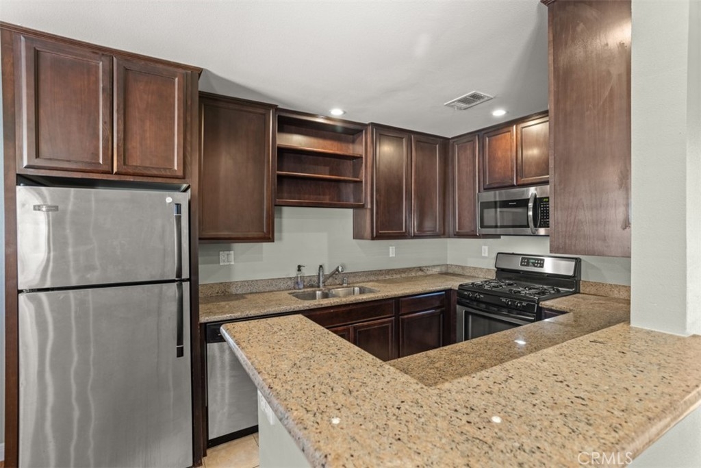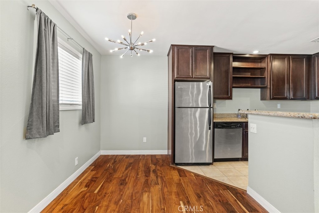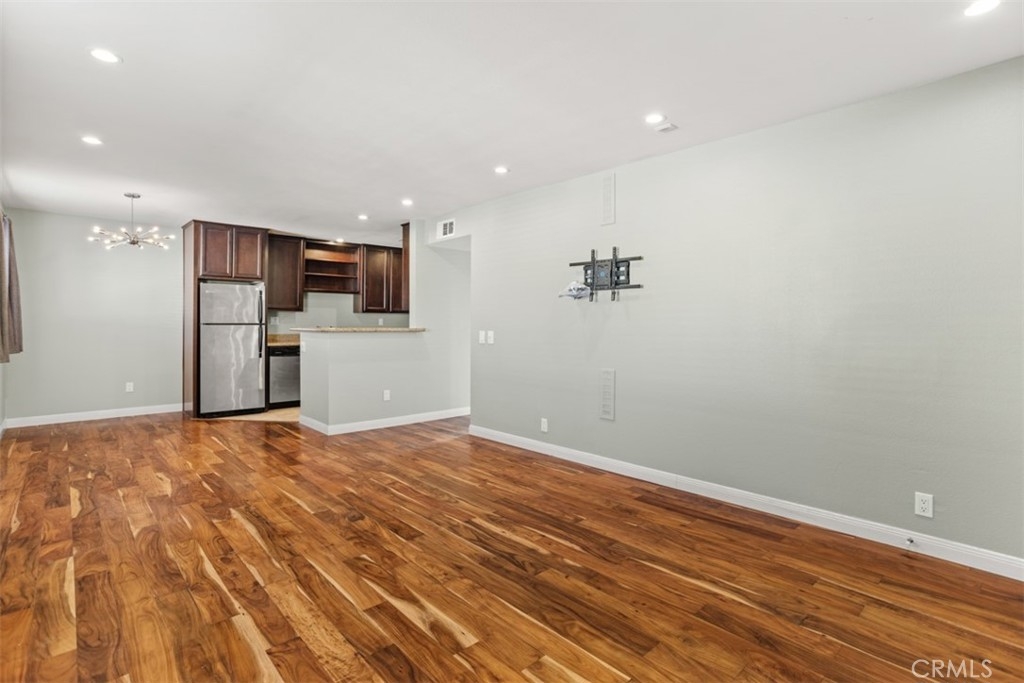 Fall in love with NOHO Arts living with this 2-bedroom, 1-bathroom, 820 sqft TOP FLOOR condo. Exquisite hardwood flooring seamlessly connects the open living space, creating an inviting atmosphere, while the bedrooms are discreetly tucked away down a private hallway. The well-appointed kitchen is designed for effortless culinary endeavors, featuring sleek stainless steel appliances, granite countertops, abundant cabinet space, and an adjoining dining area. Generously proportioned bedrooms offer ample space and oversized closets, sharing a spacious full bathroom adorned with granite countertops and rich dark wood cabinets. A convenient second door, serves to make this an en suite bathroom Significant upgrades include a new, modern A/C unit and a recently replaced roof, thoughtfully covered by the HOA, ensuring your comfort and peace of mind. Moreover, the top-floor, end unit location guarantees an unparalleled degree of privacy and serenity. Residents enjoy a range of building amenities, including secured access to the complex, convenient non-coin operated laundry facilities, and a spacious communal courtyard. Parking is effortless with a two-car tandem space in a gated garage. This exceptional property is perfectly situated in a vibrant neighborhood, with an array of restaurants, shops, and theaters right in the heart of the NOHO Arts District. Additionally, you're just moments away from the charm of Burbank's Magnolia Park District. Embrace the ease of urban living. Welcome home.