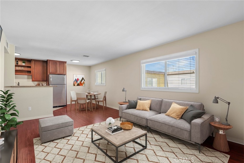 Welcome to this delightful top-floor, 2-bedroom condo nestled in the heart of the vibrant NoHo Arts District. Set within a charming, open courtyard-style building, the property has a grand, double door entrance and secure, gated underground garage, ensuring both privacy and peace of mind. Upon entering, you'll be greeted by the allure of new laminate floors that grace the entire unit, adding a touch of elegance to the space. The living room offers a beautiful wall-mounted Sony TV (that will be included in the sale) for your entertainment needs and showcases several windows that overlook the serene courtyard, allowing natural light to flood the space. The abundance of windows on the east side ensures that the living, dining, and kitchen areas bask in invigorating morning sunlight. Embracing modern comfort, the condo features central heat and air, conveniently controllable through a Nest thermostat system accessible from your phone, providing a seamless living experience. The well-appointed kitchen includes a breakfast bar and a full suite of stainless steel appliances from Frigidaire, including a gas oven/stove, refrigerator, dishwasher, and built-in microwave. The two spacious bedrooms offer ample closet space, promising comfort and storage for your belongings. The full bathroom boasts direct access from the larger bedroom and is also conveniently accessible from the hall, enhancing practicality and functionality. The complex is well-maintained with a large open courtyard and newer dual-pane windows for all units. Another one of the highlights is the inclusion of residential-grade, FREE laundry facilities in the building, with five washers and dryers available for all residents, adding to the convenience and ease of everyday living. For pet owners, the complex features a dog run along the back side, catering to the needs of your furry companions. With the added benefit of two-car tandem parking with wide spaces and a low HOA, this condo presents an excellent owner-user or investment opportunity. Do not miss out on this must-see gem in the NoHo Arts District with convenient access to cafes, restaurants, theaters & art galleries and close proximity to the Metro Red Line for easy commuting to DTLA!