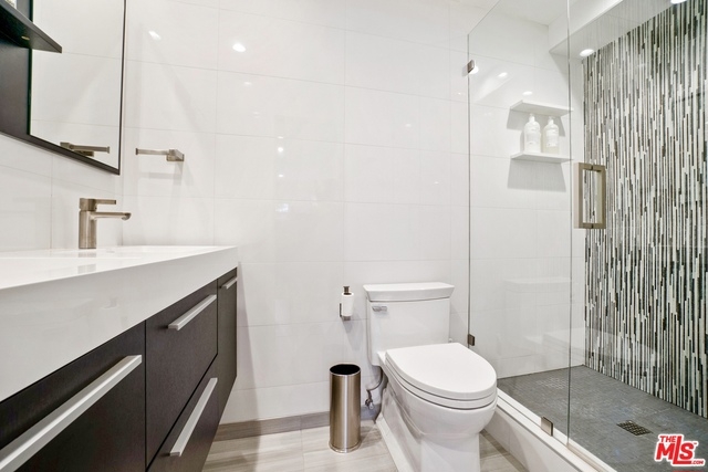 Bright and gorgeously remodeled 2 bedroom 2 bathroom unit with an open floor concept and large windows overlooking mature trees. It boasts an extra large quartz kitchen island for entertaining, double door entry, newer flooring, window shutters, vanity dual bathroom sinks, overhead speakers and in-unit laundry. There are 2 subterranean parking spaces with storage. The building has a beautiful pool lounging area. Best of it all is its proximity to the studios, conveniences, shopping, and dining & nightlife.
