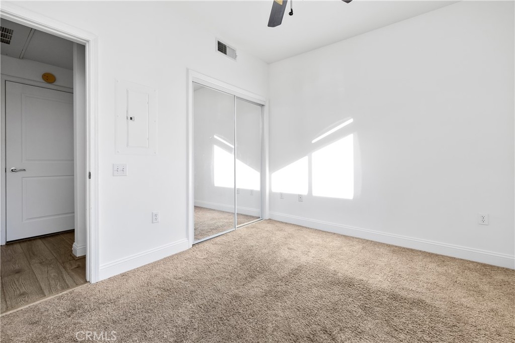 Condo priced below recent sales! Some photos have been virtually staged. Freshly painted 2 bed/2 bath top floor condo in North Hollywood, moments from NoHo West. Open concept unit in the middle of the building, away from the noise of being on Laurel Canyon. Enjoy the high ceilings, kitchen with granite countertops and stainless steel appliances, including built-in microwave. Stackable washer/dryer in unit. Both bedrooms are spacious with ceiling fan. Primary suite has a walk-in closet and large bathroom with a shower in tub. Second bathroom is also a full bathroom. Rooftop gives full view of the valley. Enjoy a cup of joe while looking at to the mountains. The community includes a gym, courtyard with tables and tandem parking spots. The HOA pays for water, trash and sewer.