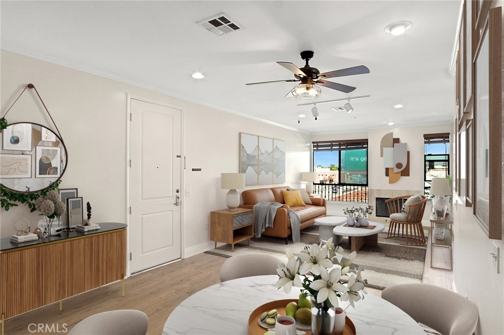 Elegantly renovated 2-bed, 2-full bath condo featuring a modern kitchen, cozy fireplace, spacious master bedroom with a home office nook, upgraded master bathroom, brand-new flooring, stylish living room fan, and fresh paint. Enjoy modern amenities, secured gated entry, gym, meeting room, rooftop patio with breathtaking views, and enclosed underground parking with two assigned spaces very close to the elevator. Conveniently located near shopping, restaurants, and major studios. Must see to appreciate!