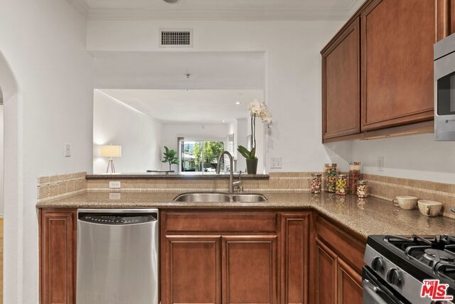 This beautifully maintained unit features 2beds plus office/den 2.5 bath. Amenities include a gourmet kitchen with granite counter tops, stainless steel appliances, in unit washer/dryer as well as a new nest system. The master bedroom boasts a large walk in closet, soaking tub, dual sink vanity and balcony. The south facing windows provide bright light throughout the day that you can enjoy in front of the fire place or out on your large living room balcony. This newer built community offers a quiet and relaxing resort style backyard with beautifully manicured grounds, modern BBQ grills, a large pool and spa. Centrally located to the studios, Metro, shopping, freeway access and walking distance to trendy restaurants in Studio City and Toluca Lake village.