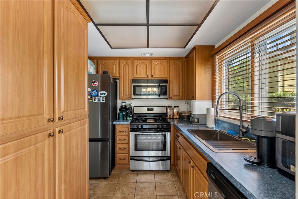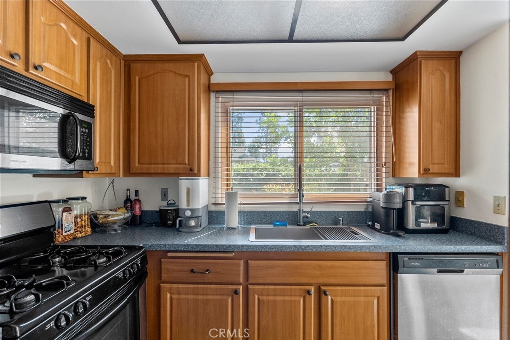 Welcome to Pepperwood Village, where comfort and convenience meet in this updated first-floor corner unit. Abundant windows bathe the interior in natural sunlight, creating a bright and inviting atmosphere. The kitchen boasts stainless steel appliances, ample cabinetry, and a generous pantry, making it a delightful space for culinary endeavors. This 2-bedroom, 1-bathroom unit features a spacious living and dining area, complemented by a warm fireplace that adds a cozy touch to the space. For your laundry needs, you'll appreciate the in-unit washer and dryer, complete with convenient storage space. A semi-private garage provides parking for one vehicle, and a private patio offers a peaceful outdoor retreat. Pepperwood Village is a community adorned with many trees and well-maintained lawns, creating a serene setting. Residents can take advantage of the community's amenities, including a sparkling swimming pool, a relaxing spa, and ample guest parking. HOA fees of $404 per month cover water and earthquake insurance, simplifying your monthly expenses. This central location at 6716 Clybourn Ave #131 places you near Burbank, Studio City, the NoHo Arts District, Media Center Mall, Hollywood-Burbank Airport, and all major studios, including Universal, NBC, Warner Bros, and Disney. Embrace the best of Southern California living in this inviting Pepperwood Village unit. Don't miss your chance to make it your new home!