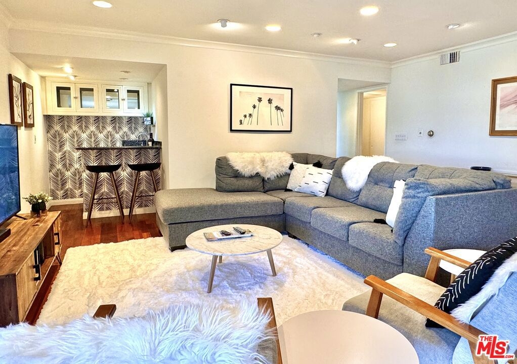 Welcome to the most stylish and well-priced condo in all of Toluca Lake! Truly the crown jewel of the building with the perfect placement (a front facing unit with a generous balcony) and a new elevator only shared with 4 other units total. A stone's throw and walk- to all of prestigious Toluca Lake's hottest shops and restaurants, this 2 bed 2 bath is 1267 square feet, but feels huge! The spacious living room is gleaming with Brazilian cherry hardwood floors and gets plenty of natural light. Sliding French doors lead out to the spacious balcony where there are refreshing mountain views. A perfectly updated wet bar adds a fun updated vintage detail! Incredible amounts of closet and storage space. The kitchen is newly renovated with new stainless appliances and hardwood cabinetry. This condo comes with an award winning school district and amazingly can be delivered furnished or unfurnished! Pool and lobby have been freshly remodeled and the building is incredibly quiet. HOA includes gas, electricity, gardener, water, trash and common insurance. Close to major freeways and all of the best the valley has to offer. Come see for yourself!