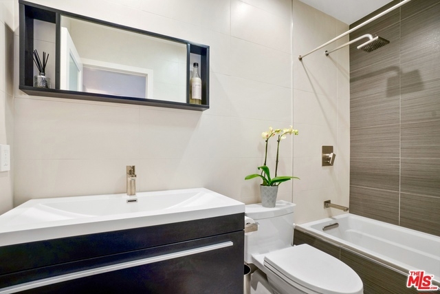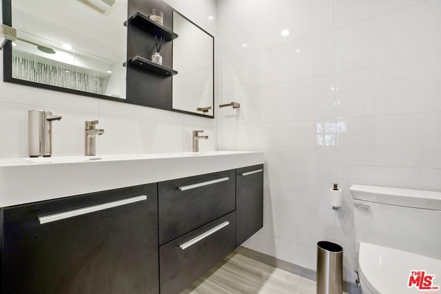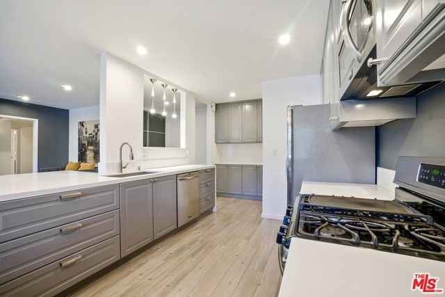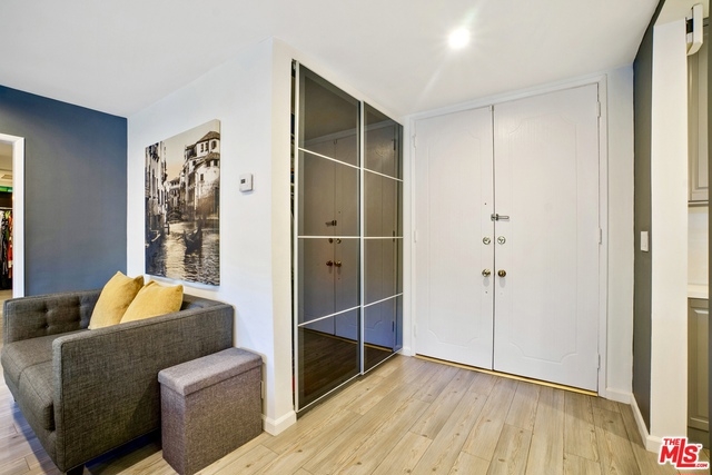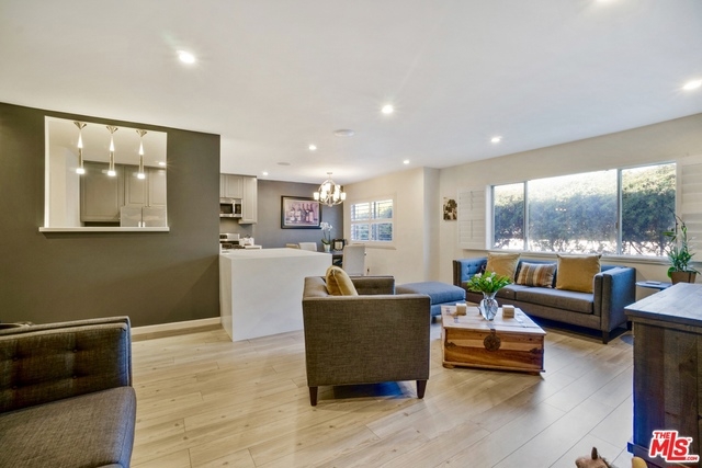 Bright and gorgeously remodeled 2 bedroom 2 bathroom unit with an open floor concept and large windows overlooking mature trees. It boasts an extra large quartz kitchen island for entertaining, double door entry, newer flooring, window shutters, vanity dual bathroom sinks, overhead speakers and in-unit laundry. There are 2 subterranean parking spaces with storage. The building has a beautiful pool lounging area. Best of it all is its proximity to the studios, conveniences, shopping, and dining & nightlife.