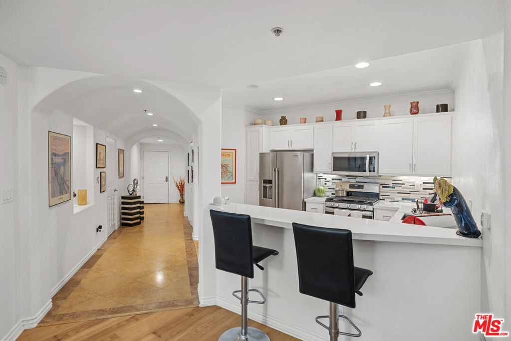 Welcome Home to this rare light-filled Penthouse Unit in a beautiful building in sought after West Toluca Lake! You are welcomed into the main living spaces that feature an open Kitchen with Breakfast Bar, Dining Area and Living Room with dramatic high ceilings and cozy Fireplace. The gourmet Kitchen has new Quartz countertops, new cabinets with pull out drawers and soft close feature, beautiful tile backsplash and new stainless steel appliances. High-grade flooring is featured throughout along with many windows providing an abundance of natural light. This thoughtfully upgraded condo features two spacious ensuite bedrooms. The Primary Suite boasts a cozy fireplace, an oversized limestone shower, soaking tub, impressive master closet and french doors leading to the patio. Enjoy coffee on your private terrace overlooking the common area and mountain views. Other features include: Travertine tile flooring in entrance, convenient in-unit laundry, recessed lighting, central air and heat, controlled access building, and guest parking. There are two tandem assigned parking spaces in the gated garage. Professionally run and well managed HOA with impeccable grounds, dual BBQ's, sparkling pool and spa and lushly landscaped common areas. Stroll to all the shops, restaurants and live theater on Riverside Drive. Close to NOHO Arts district, freeways and Studios.