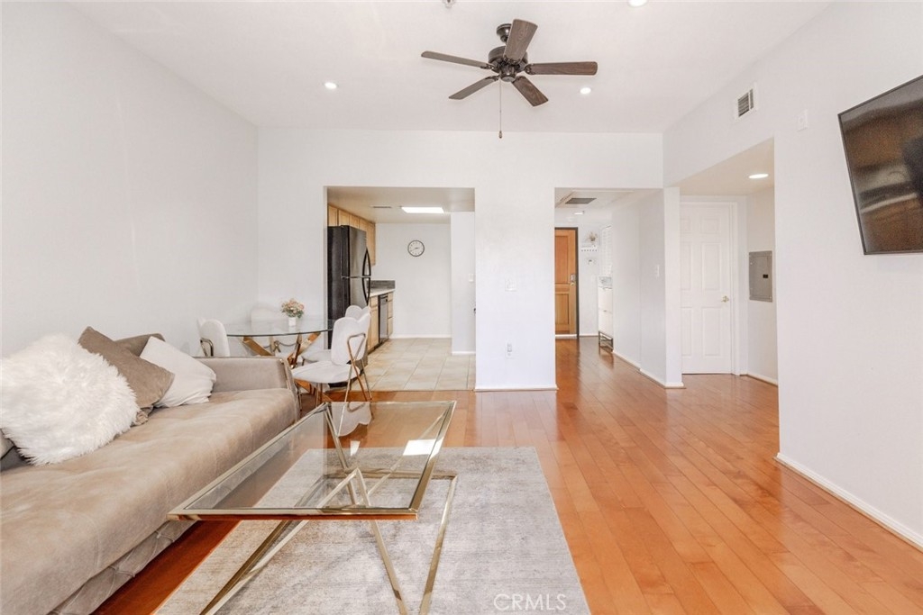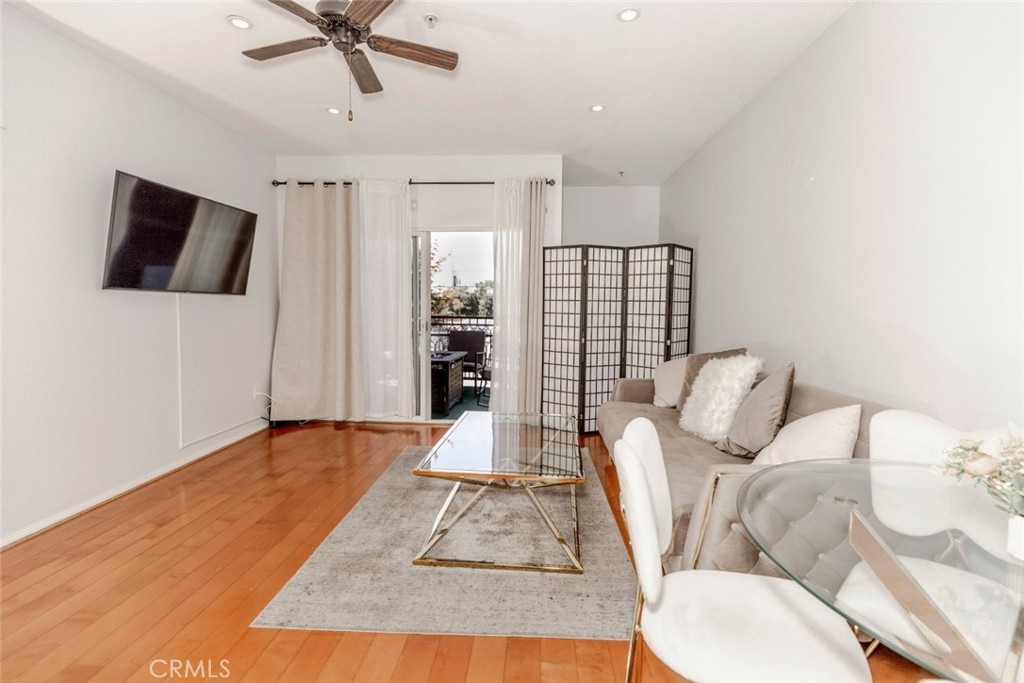 Welcome to this bright and inviting 2-bedroom, 1-bathroom condo located in the heart of North Hollywood. Offering approximately 800 square feet of thoughtfully designed living space, this residence combines comfort, functionality, and a desirable indoor-outdoor lifestyle. The open-concept living and dining area features warm wood flooring, recessed lighting, and a seamless flow into the kitchen, creating an ideal setting for both everyday living and entertaining. The kitchen includes ample cabinetry and convenient access to the main living areas. The spacious bedroom offers great natural light, high ceilings, and a comfortable layout, while the bathroom is well-appointed with a clean, modern feel. Enjoy your private balcony retreat, complete with a cozy seating area, perfect for relaxing or hosting. Community parking adds everyday convenience. Ideally situated near shopping, dining, and entertainment in North Hollywood.