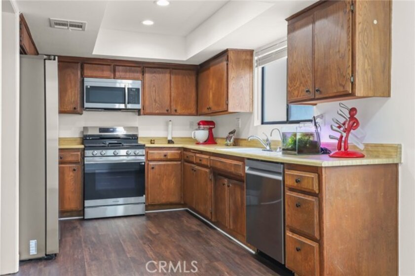 This upgraded tri level townhome offers the privacy of an exterior location combined with the space and comfort today’s buyers value. The main living level features new vinyl flooring, soaring ceilings, central air and heat with a smart thermostat, and an open living room centered around a fireplace with direct access to a private front patio. A formal dining area provides flexibility as a dining room, home office, or additional living space. The large eat in kitchen offers generous cabinetry and counter space, new recessed lighting, and new stainless steel appliances including a dishwasher, refrigerator, stove, and microwave hood vent. A convenient half bath completes the main level. Upstairs, both bedrooms are privately positioned and include walk in closets and en suite bathrooms. The primary suite is exceptionally spacious and includes a large walk in closet, private balcony, and a recently remodeled bathroom with a new tub. An upper level laundry closet with newer Samsung washer and dryer adds everyday convenience. Additional highlights include a private two car garage with direct access and a gated community setting. Located outside the interior of the complex, the home enjoys added privacy while remaining close to shopping, dining, and major commuter routes. A thoughtfully designed townhome that lives like a home, offering space, functionality, and meaningful upgrades throughout.