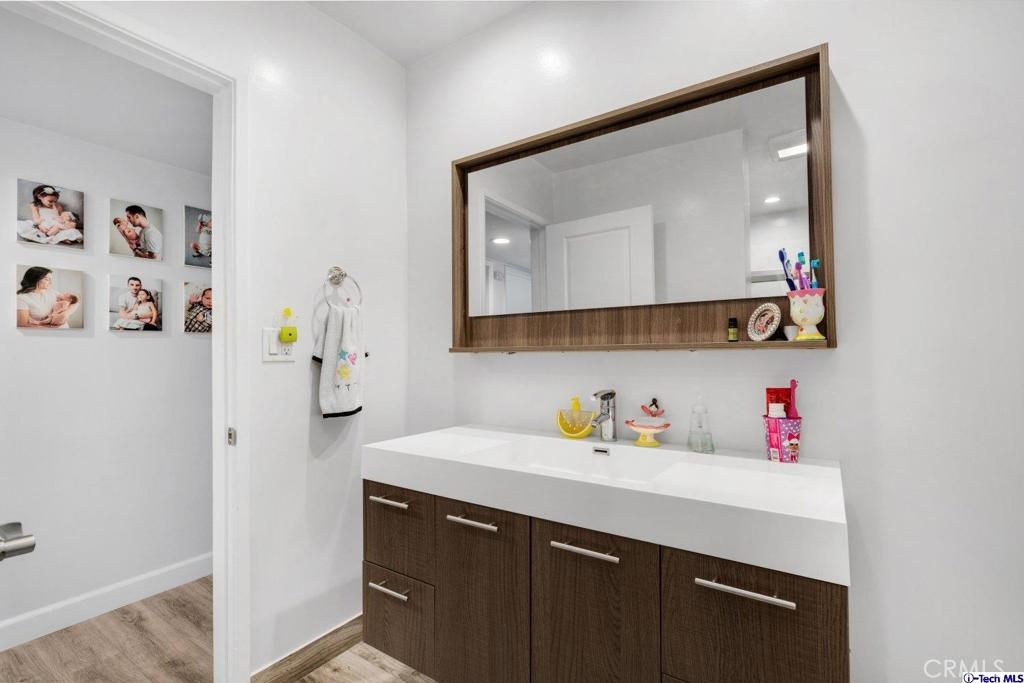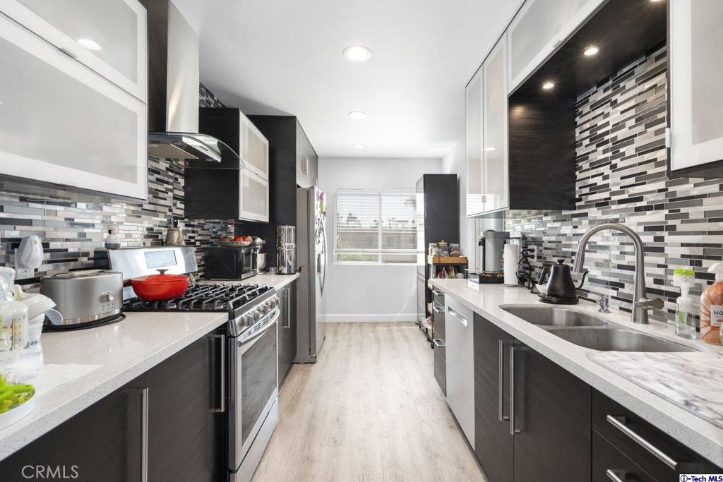 From the coveted city of North Hollywood, welcome home to this wonderful 3-bedroom, 2-bathroom, 1,541-SqFt modern condo! Upon entry, you're immediately immersed in an airy living room with adjoining dinning room featuring calming grey tone laminate floors, sliding glass door access to a private balcony patio space with neighborhood views, inset fireplace with a texture stone feature wall, and recessed lights, providing a comfortable space for all you entertaining needs. Venture towards the modern monochromatic kitchen enhanced by grey cabinetry with sleek handles and frosted glass doors for the upper cabinetry, granite counters, tiled backsplash, and stainless-steel appliances. There is a laundry area inside your unit too! The primary bedroom features an en-suite bathroom highlighted by recessed lights, a walk-in shower, and a dual vanity with extra storage. Plus, this great home includes plenty of additional built-in storage in the main hallway. The complex includes 2-carport spaces, a community laundry room, patio lounge space, and a glittering community pool to enjoy. Nearby Valley Glen Community Park, down the street from Starbucks, local restaurants and business, Vallarta Supermarkets, Walgreens, CVS, Los Angeles Valley College, minutes from NOHO West and the NOHO Arts District, plus easy access to the 170 Freeway!
