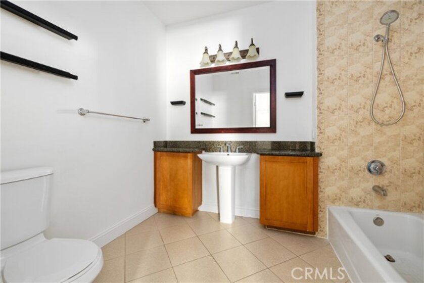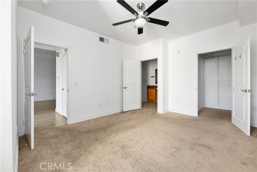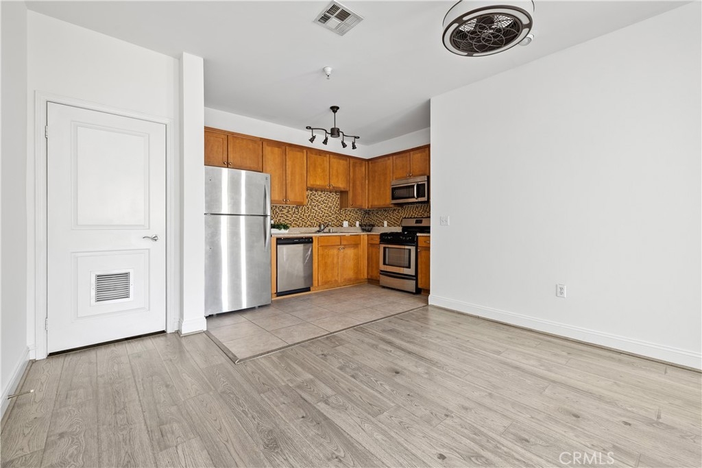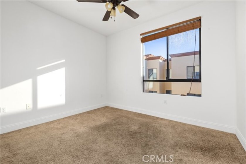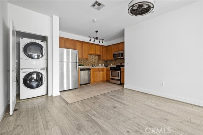 Freshly painted 2 bed/2 bath top floor condo in North Hollywood, moments from NoHo West. Open concept unit in the middle of the building, away from the noise of being on Laurel Canyon. Enjoy the high ceilings, kitchen with granite countertops and stainless steel appliances, including built-in microwave. Stackable washer/dryer in unit. Both bedrooms are spacious with ceiling fan. Primary suite has a walk-in closet and large bathroom with a shower in tub. Second bathroom is also a full bathroom. Rooftop gives full view of the valley. Enjoy a cup of joe while looking at to the mountains. The community includes a gym, courtyard with tables and tandem parking spots. The HOA pays for water, trash and sewer.