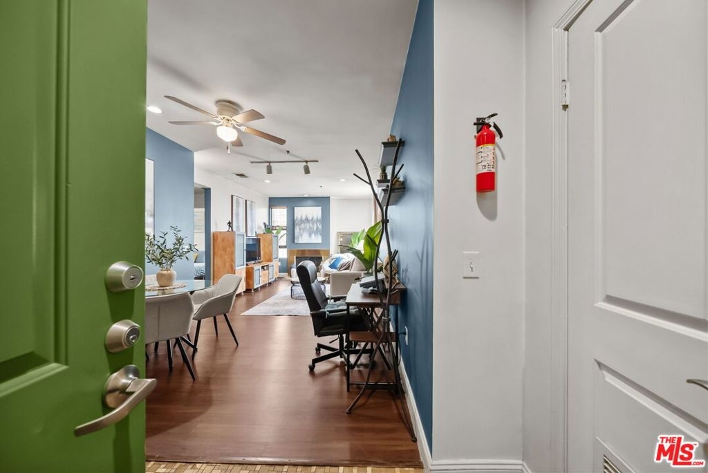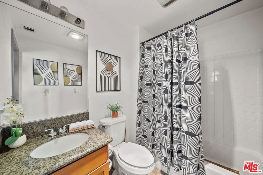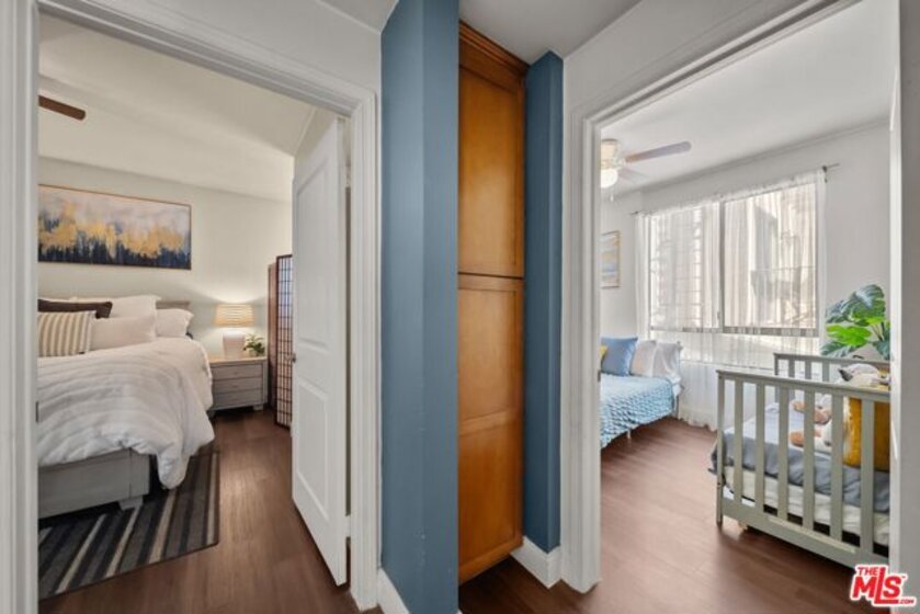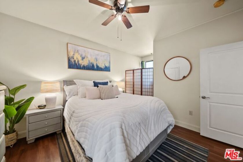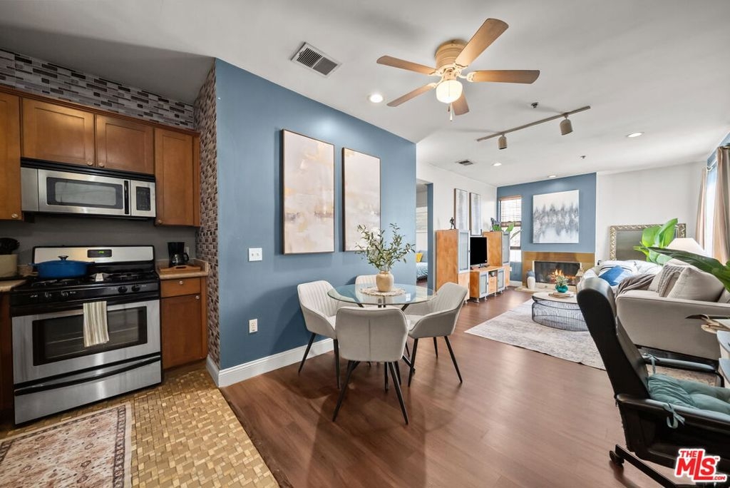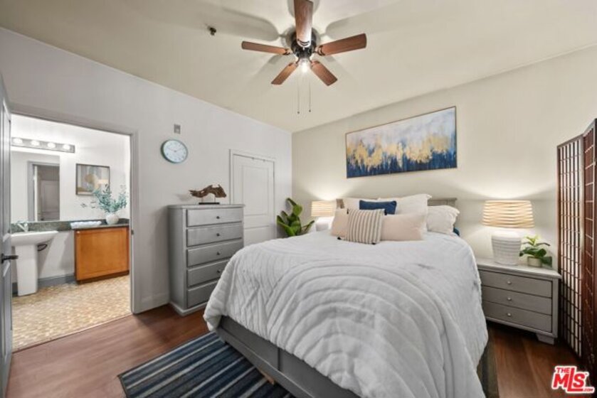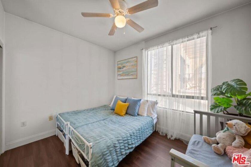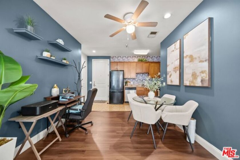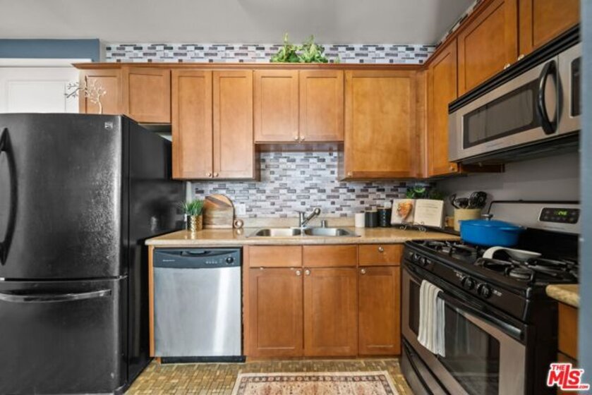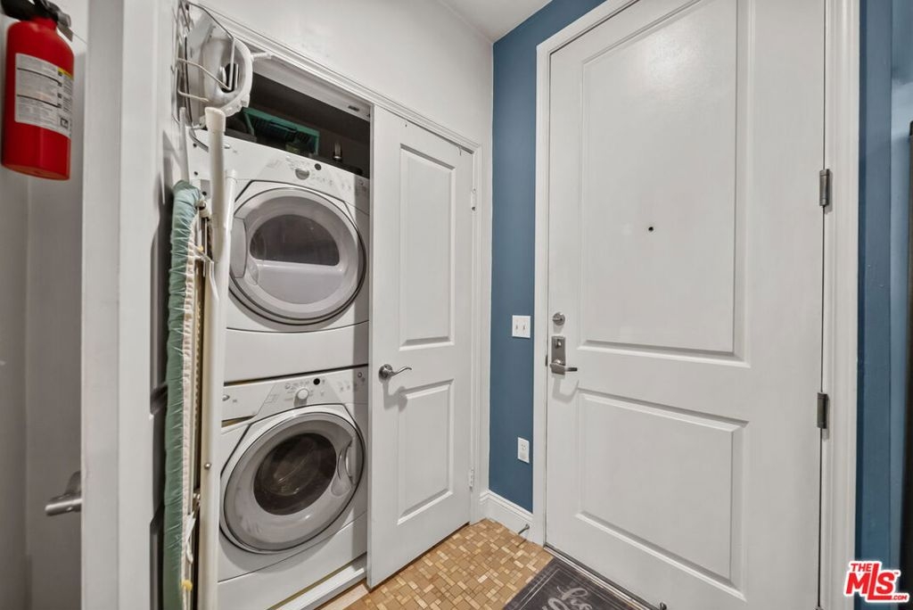 Highly desirable 2 Bed/ 2 Bath unit ideally located on the top floor of the beautiful Laurel Bliss building. Thoughtfully designed with spacious contemporary floor plan, this residence is enhanced by soaring ceilings and natural light. It features a well-appointed kitchen that flows seamlessly into the dining and living areas, wonderful for everyday living and entertaining. The primary bedroom offers a large closet and a versatile nook-ideal for a workspace or reading corner. A convenient pantry closet houses and in unit stacked washer and dryer, along with generous storage space. Residents also have access to a fitness center, conveniently located in the lobby. They also enjoy access to a remote controlled garage with two tandem parking spaces and additional guest parking. The buildings open air corridors frame a tranquil central courtyard, while the rooftop patio provides sweeping views of the valley and a spectacular vantage point for fourth of July fireworks. Homeowners association dues include trash, and recycling services, hot water, sewer, and master insurance policy. Perfectly positioned in the heart of North Hollywood you are just minutes from NoHo West's vibrant shopping, dinning, and entertainment destinations, as well as an array of cafes, theaters, parks, and grocery options. With easy access to the 101 and 170 freeways, it offers a seamless blend of everyday convenience with a vibrant connected lifestyle.